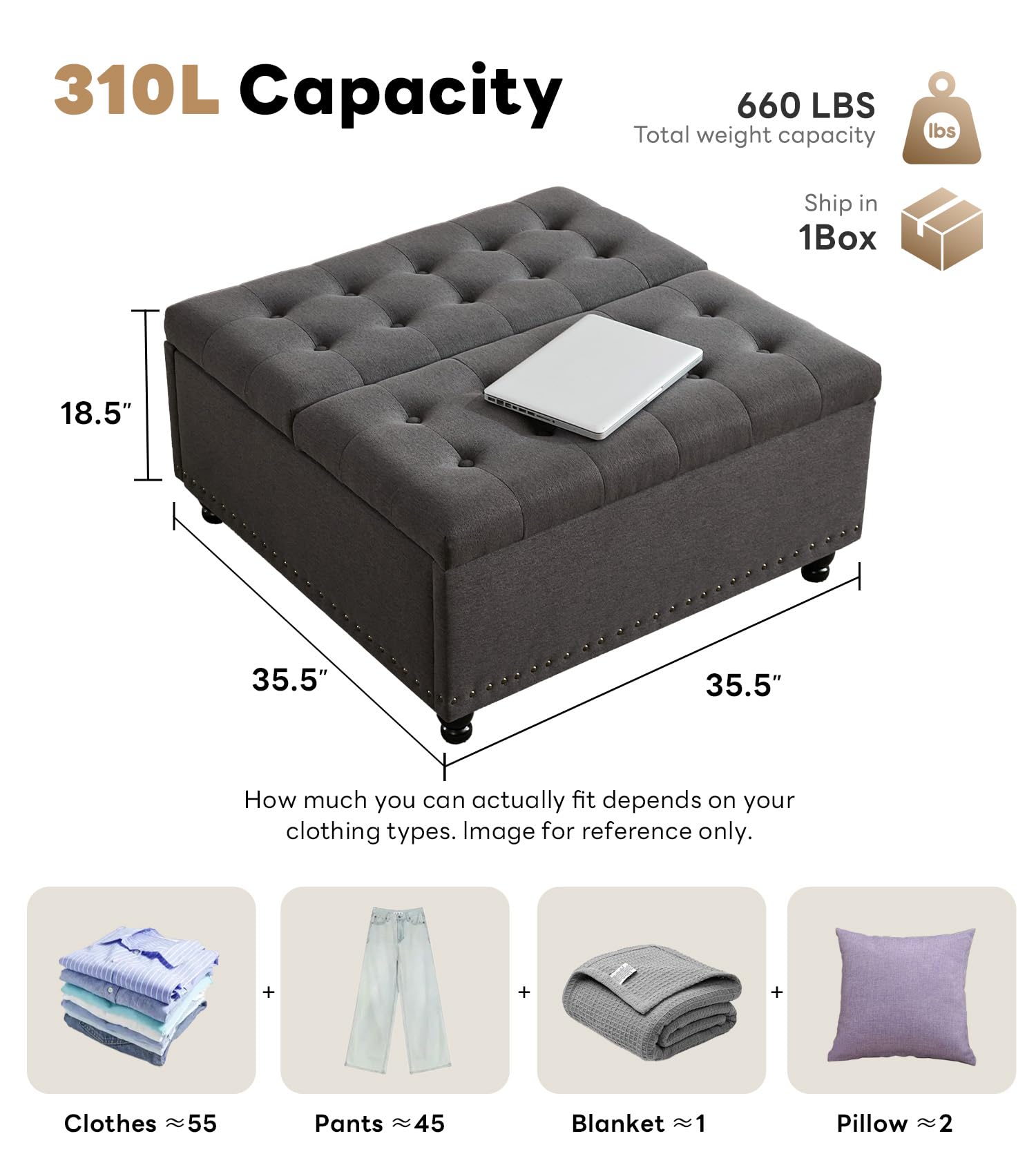 - LARGE STORAGE】The size of the Tbfit square ottoman is 35.5″L*35.5″W*19″H. Use the large storage ottoman to store extra throw blankets, pillows, toys, magazines, or other items, keeping them within reach but neatly out of sight. You will love how much your space can transform with the simple addition of this charming ottomans.