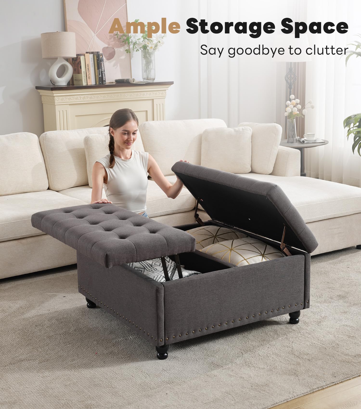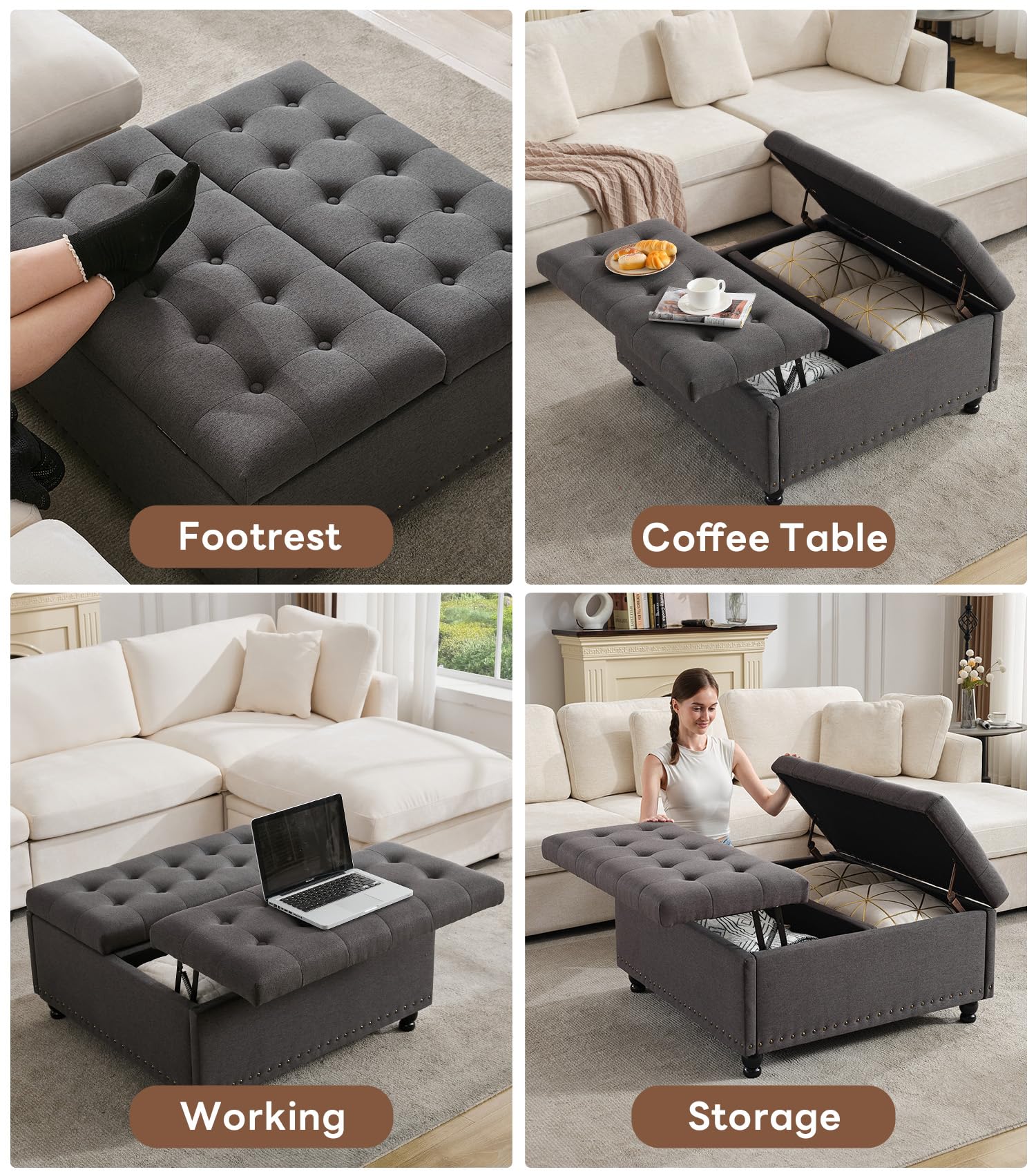 - 【CONSIDERATELY SERVICE】You can add an exquisite ottoman to your living room or bedroom. We use durable hinges, so when you fully open it, the upholstered tops can stay open. For safety concerns, please do not let your family members under the age of 15 play around with the ottoman when the tops open. Tbfit has an excellent after-sale service team, please feel free to contact us if you have any questions. We are glad to serve you.